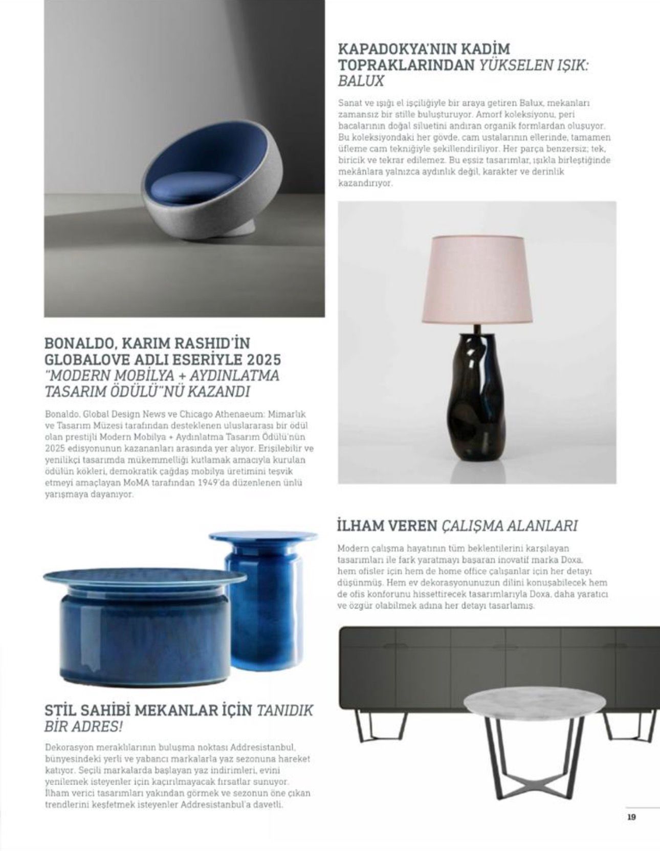 El işçiliği ve modern tasarım anlayışını buluşturduğumuz Amorf&Avanos Koleksiyonlarımızda, dijital basın yayınlarında ve önde gelen ev dekorasyonu dergisinde yer aldık. Doğal formlardan ilham alan, zamansız çizgilerle şekillenen ve tıpkı doğada olduğu gibi asimetrik formlarda olan el yapımı abajurlarımız; yaşam alanlarına yalnızca ışık değil, özgün bir kimlik kazandırıyor.
